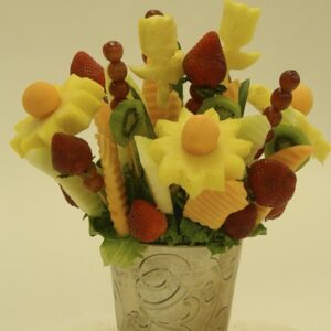 It’s a creative and tasty way to celebrate a special birthday. With its festively decorated pineapple cupcakes and additional add-ons, this fruit basket arrangement is not only visually stunning, but also delicious and fun, turning any birthday celebration into an unforgettable event.