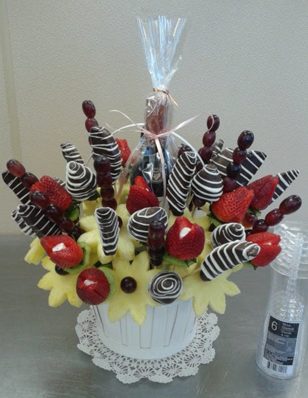This exquisite detailed and elegant bouquet combines the vibrancy of flowers recreated by sweet pineapples, delicious chocolate-covered apples, sweet grapes and a good wine. It offers an experience that will satisfy your sweetest cravings, giving a touch of sophistication and celebration to the occasion.