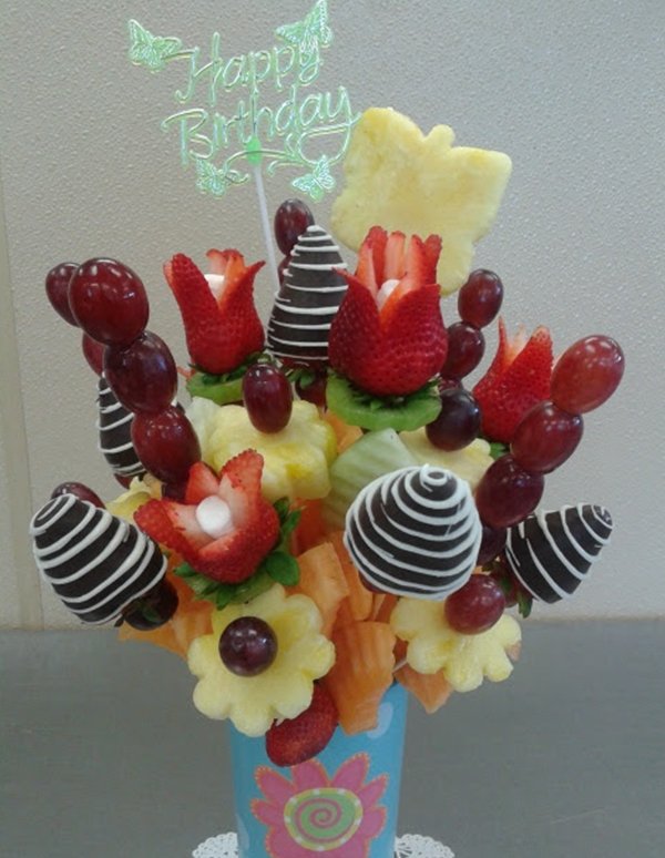Some detailed arrangement that work perfectly for a variety of occasions, such as weddings, anniversaries, birthdays and other special events, as they are accompanied by delicious strawberries dipped in chocolate, beautiful butterflies recreated by sweet pineapples by our best fruit florist, delicious grapes and delicious kiwis to satisfy the need for freshness.